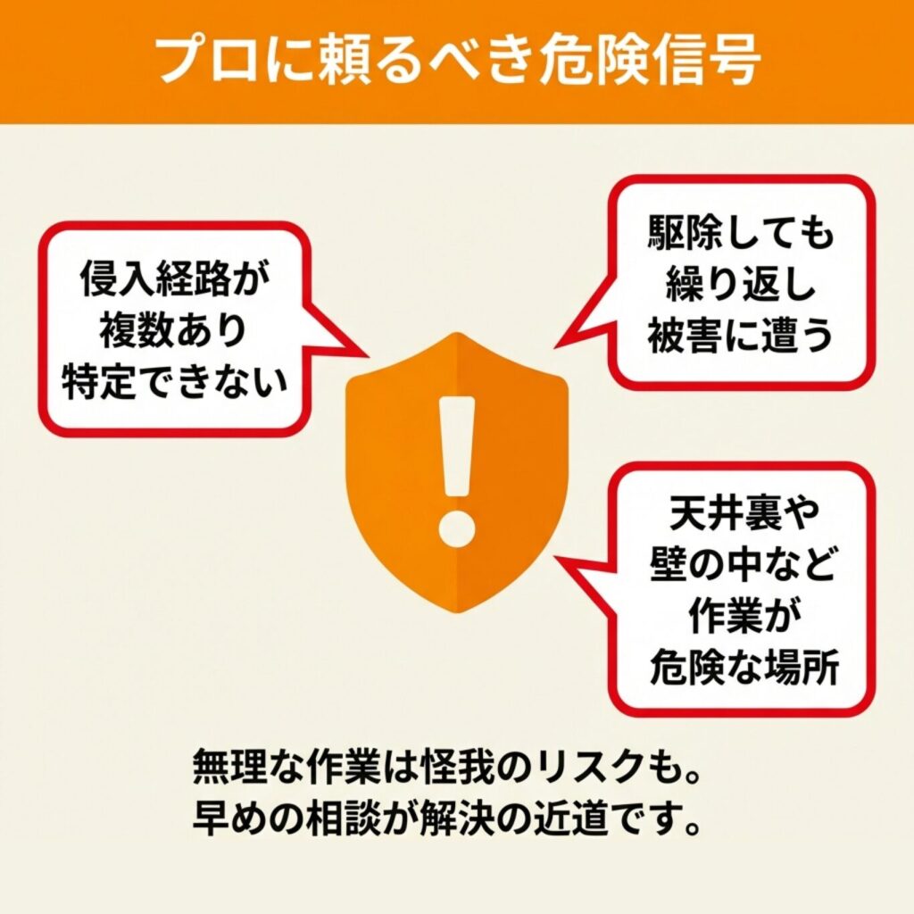 特に侵入経路の特定が難しいケースや、被害が広範囲に及んでいる場合は、早めに相談することをおすすめします。