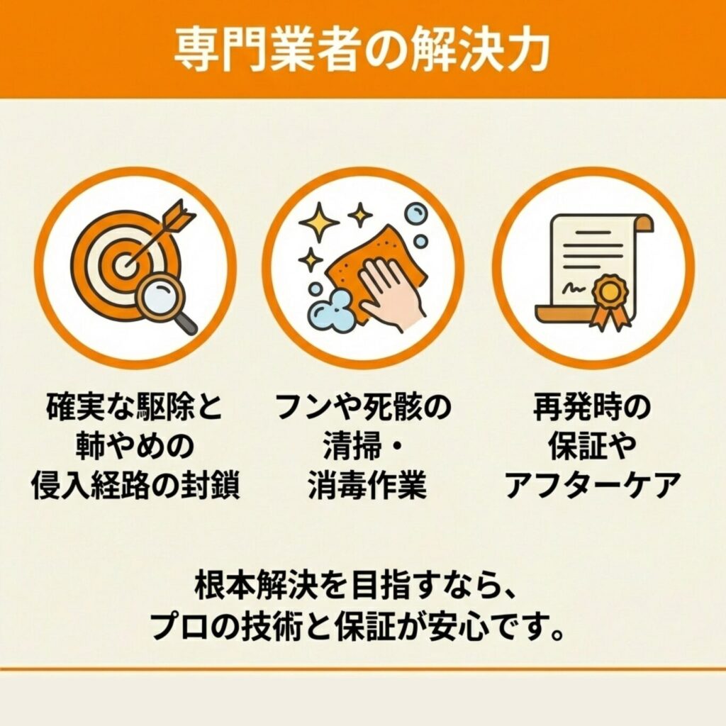 専門業者に依頼する最大のメリットは、確実な駆除と再発防止対策を同時に行ってもらえる点です。