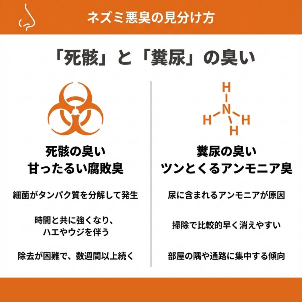 ネズミの糞尿と死骸では、臭いの種類がまったく違います。