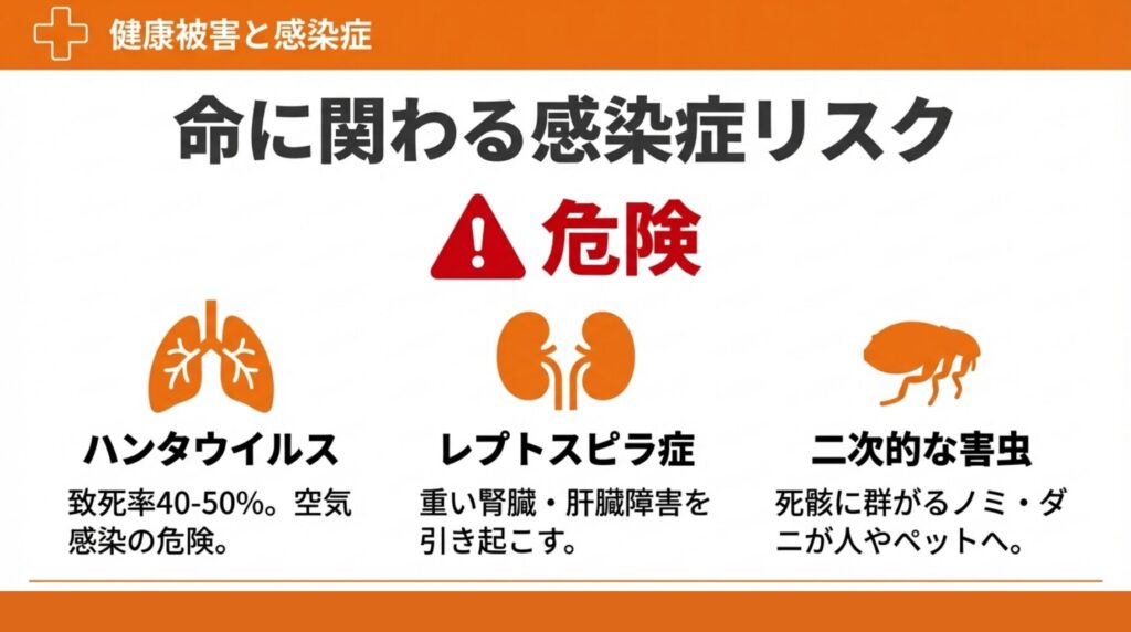 ハンタウイルスやレプトスピラ菌、サルモネラ菌などは命に関わる病気を引き起こすでしょう。