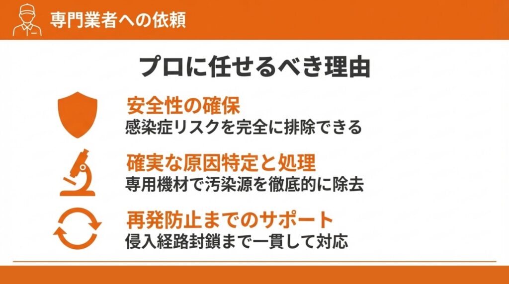 自力処理に失敗した場合の再処理費用、建材の損傷、感染症の治療費を考えると、業者費用は決して高くありません。