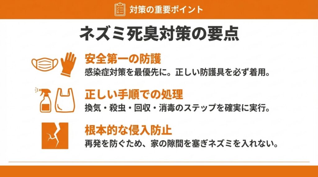 根本的な解決には、死骸除去だけでなく侵入経路の封鎖と予防対策まで含めた総合的なアプローチが必要でしょう。