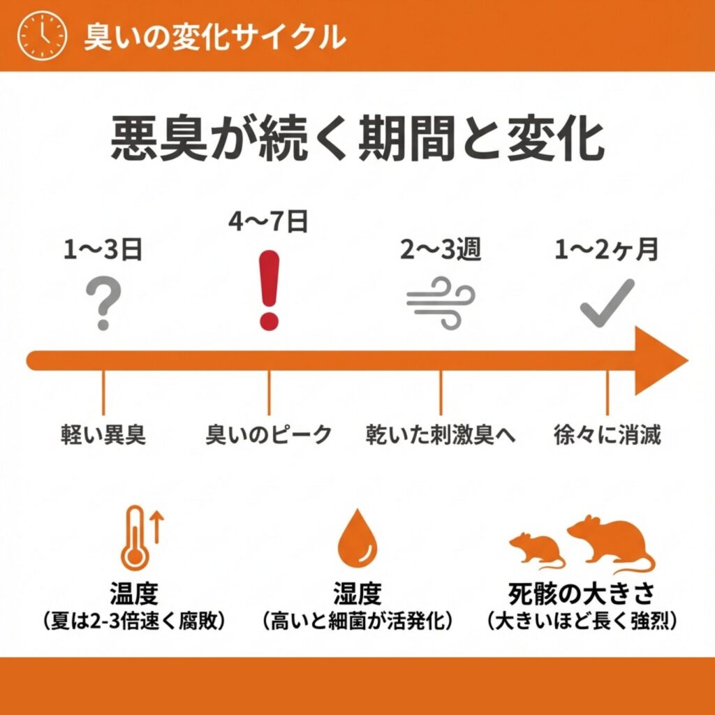 糞尿の臭いは掃除すれば比較的早く消えますが、死骸臭は放置すると数週間以上続くことも珍しくありません。