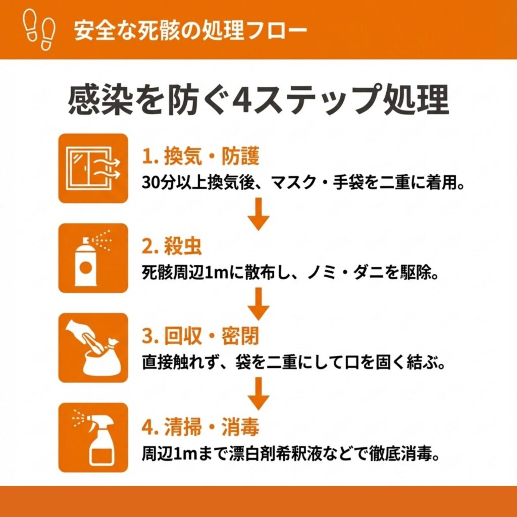 ネズミ死骸の処理は、段階的に進めることで感染リスクを最小限に抑えられます。