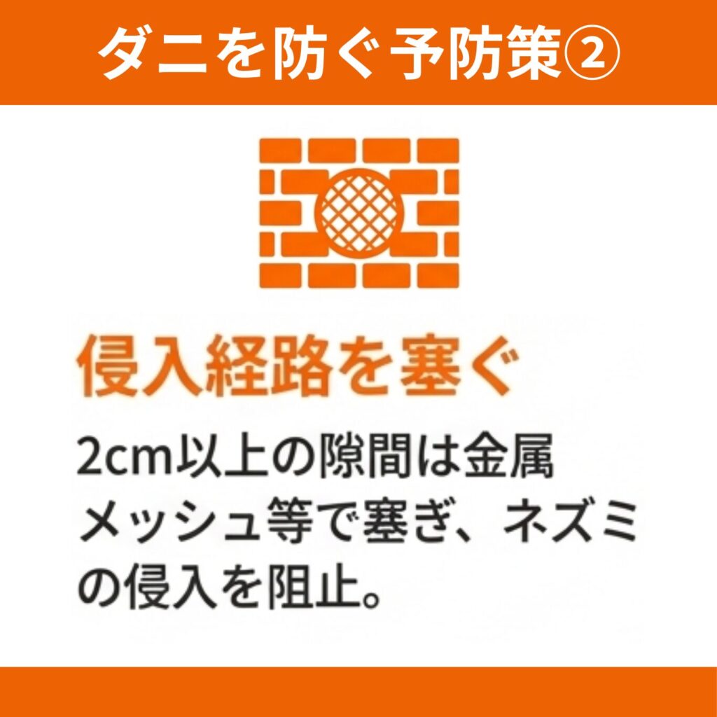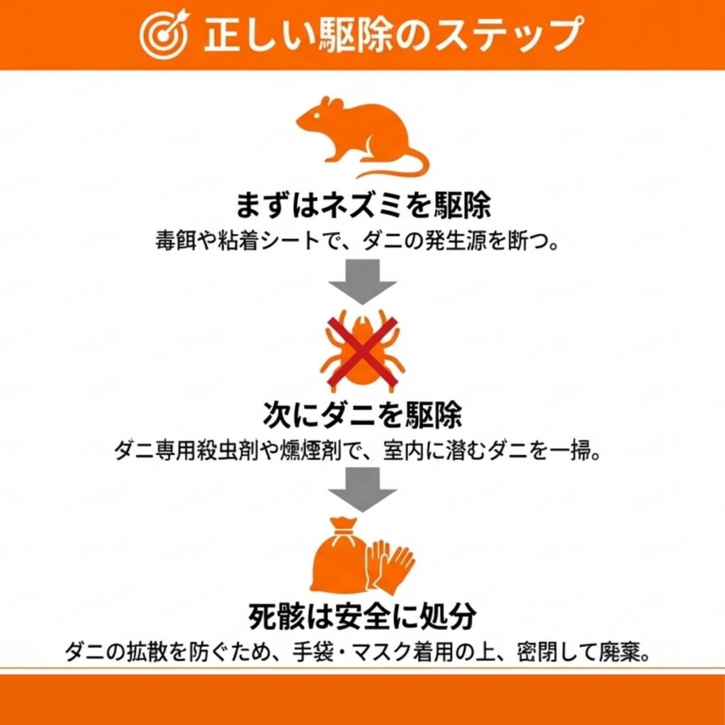 ダニ被害を根本的に解決するにはネズミの完全な駆除が必要であり、侵入経路の封鎖と環境整備を含めた総合的な対策が求められます。