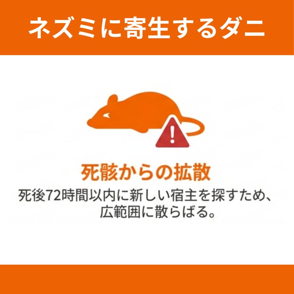 そのため、死んだネズミの周りから大量のダニが散らばり、人間や他の動物を求めて移動を始めます。