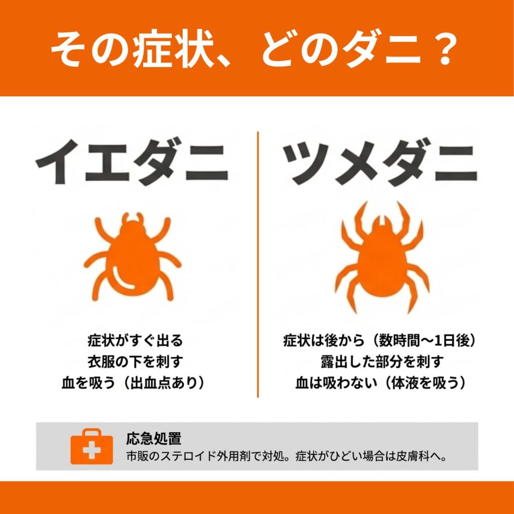 イエダニは刺された直後からかゆみが始まりますが、ツメダニは数時間〜1日後に症状が出ます。