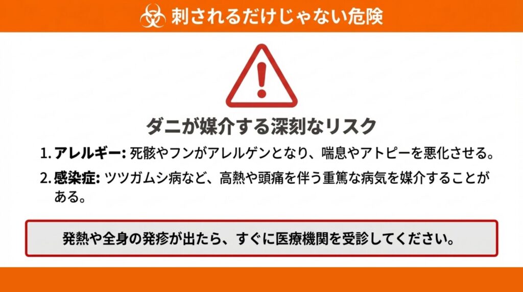 イエダニは激しいかゆみや発疹を引き起こすだけでなく、アレルギーや感染症の原因になる可能性もあります。