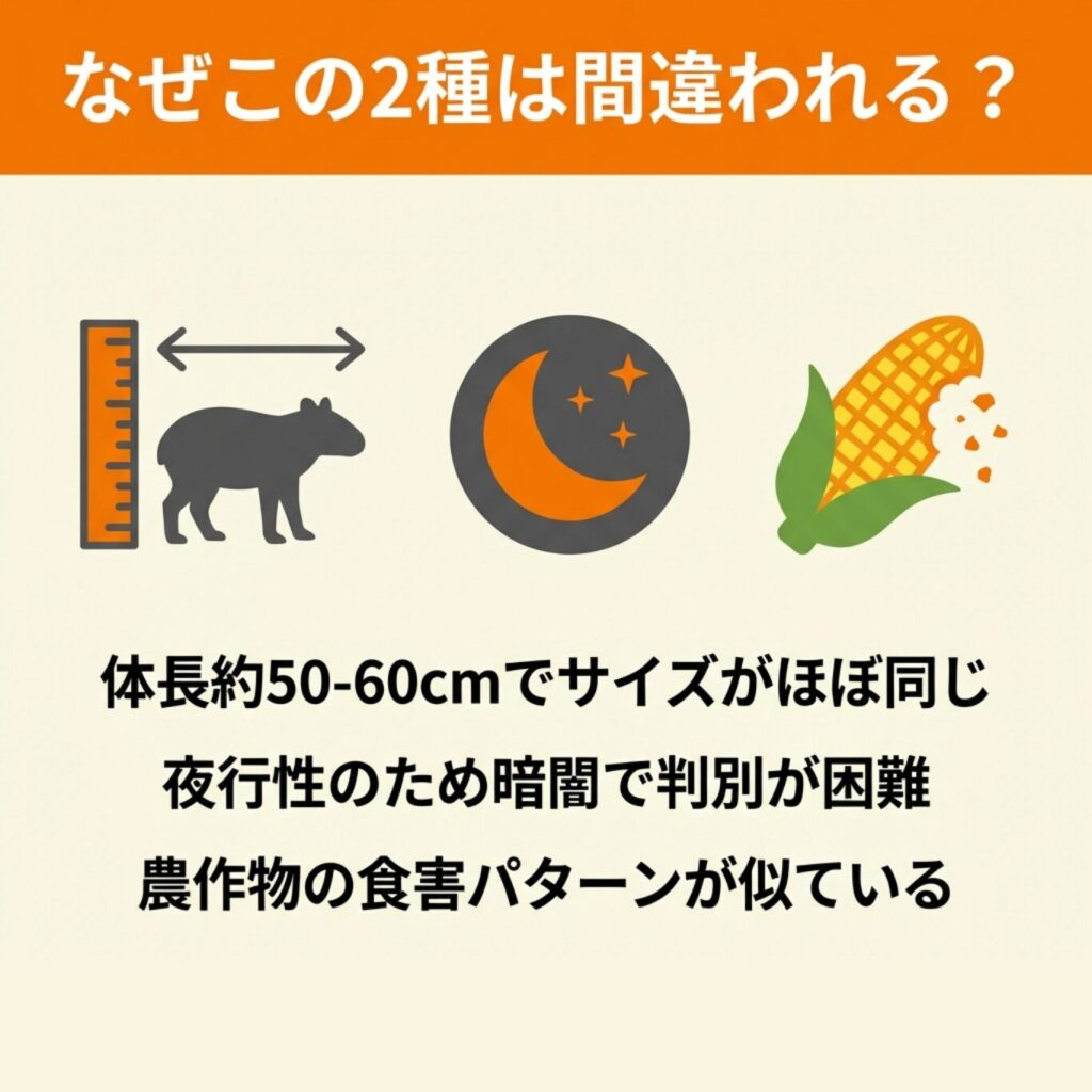 たとえば、どちらもトウモロコシを好んで食べるため、畑が荒らされた場合に「どちらの仕業か」を即座に判断するのは困難です。