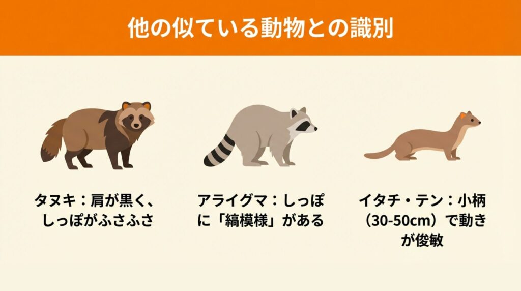 ハクビシンは「黒い顔に白い鼻筋・スリムな体型・長いしっぽ」、アナグマは「白い顔に黒い目元の模様・ずんぐり体型・短いしっぽ」という違いを覚えておきましょう。