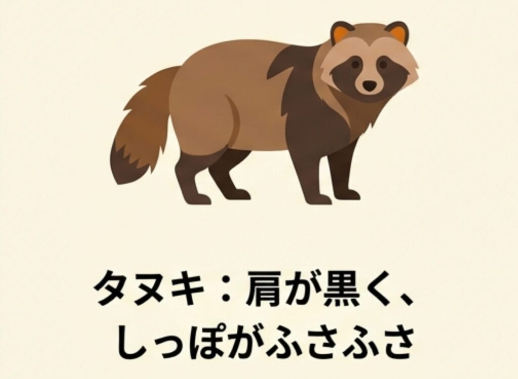 タヌキは肩回りが黒くしっぽがふさふさしている