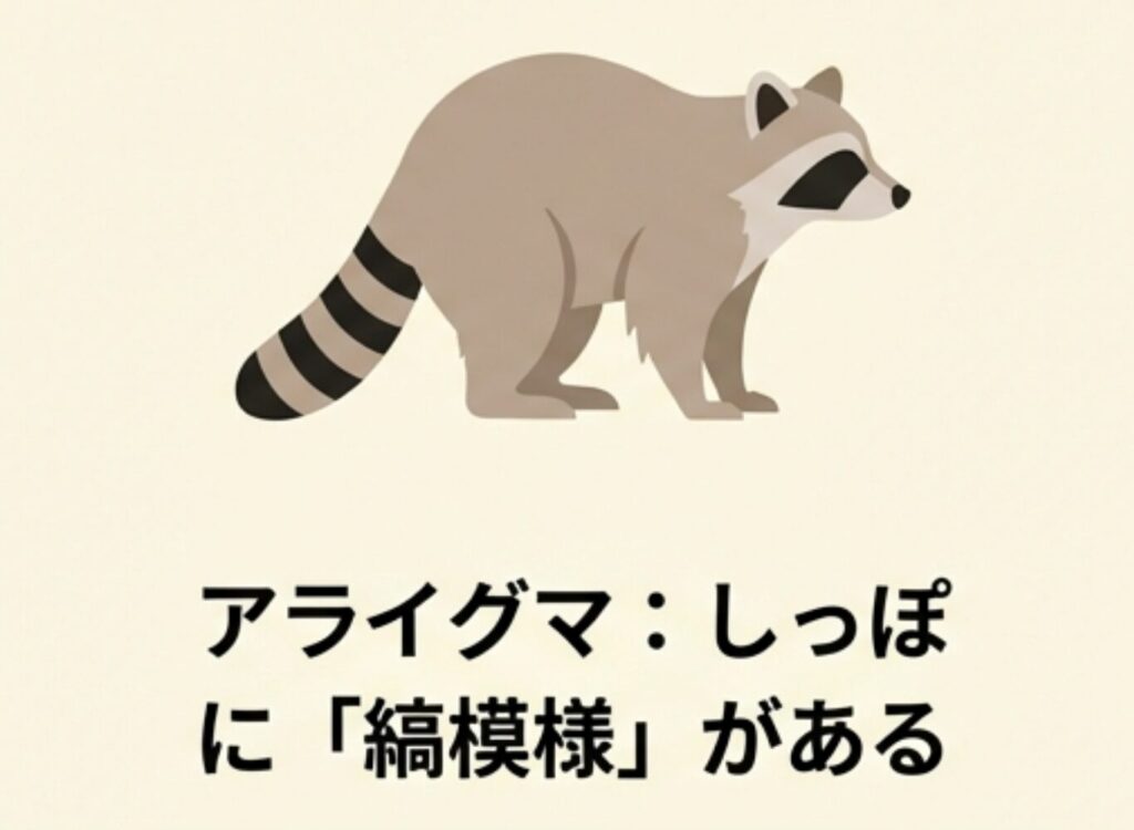 アライグマはしっぽの縞模様が決め手です。特定外来生物に指定されているため、見つけた場合は自治体への報告も検討しましょう。