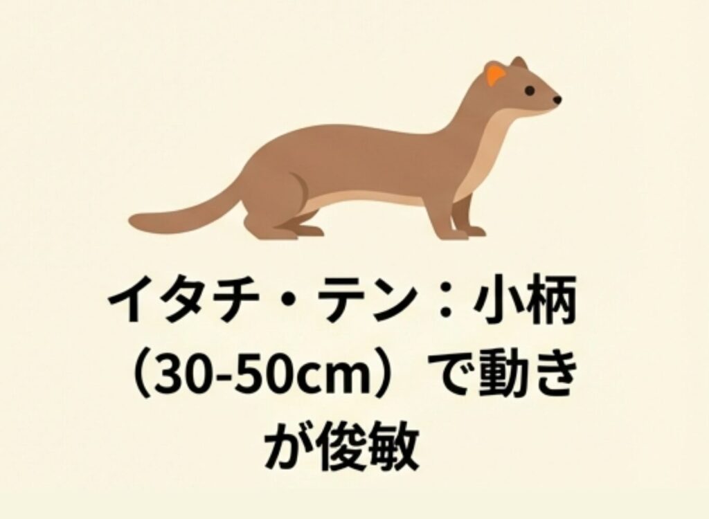 ハクビシンやアナグマより明らかに小さく、動きが俊敏な動物を見かけた場合は、イタチやテンの可能性を考えましょう。