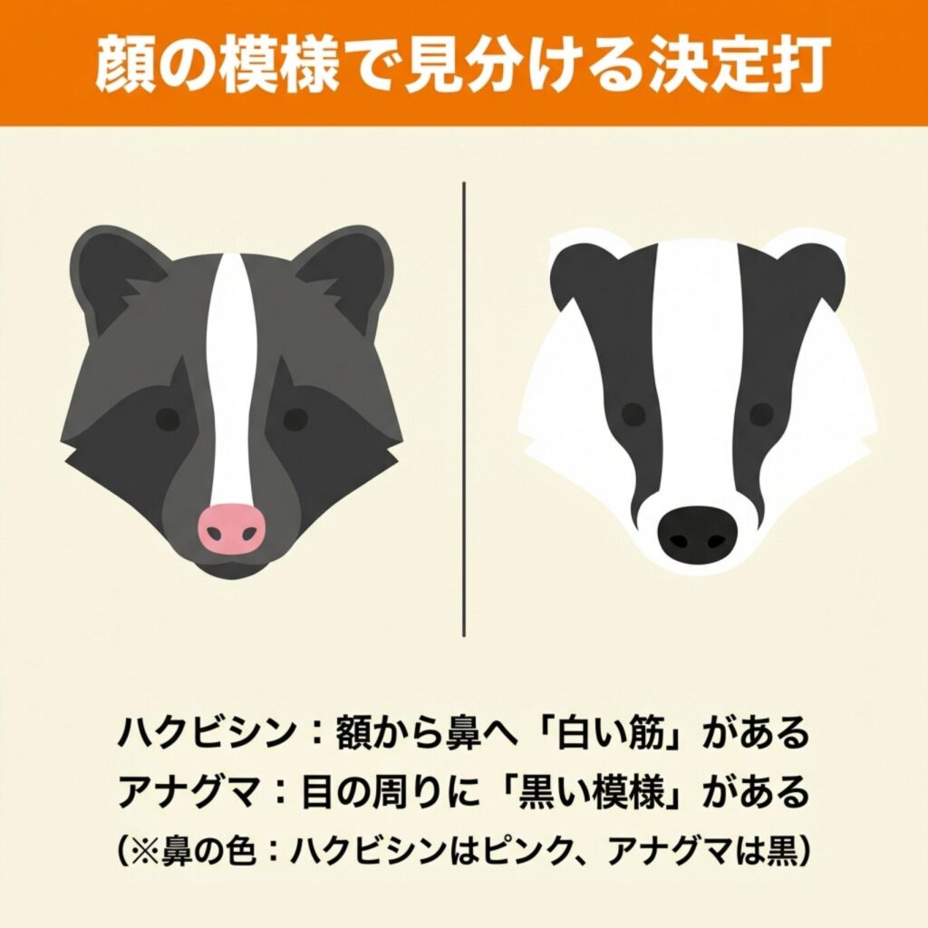 ハクビシンとアナグマを見分けるうえで、最も分かりやすいポイントが顔の模様です。