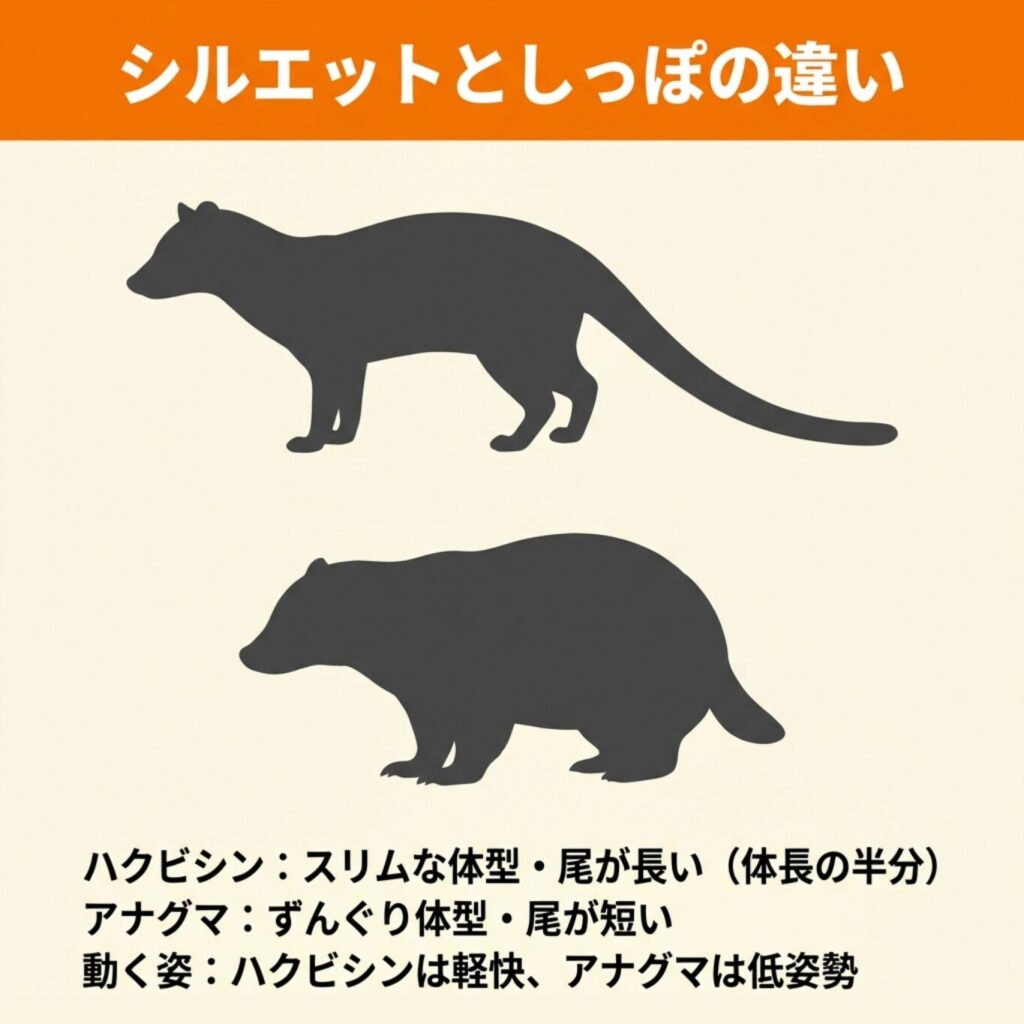 ハクビシンは細長い体に長いしっぽがついた「スリムなシルエット」、アナグマは丸い体に短いしっぽの「ずんぐりしたシルエット」という違いがあります。