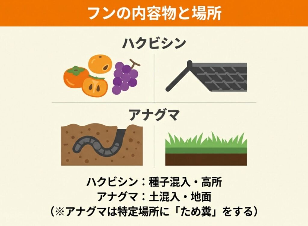 フンに果物の種が多ければハクビシン、土が混じっていればアナグマと推測できます。