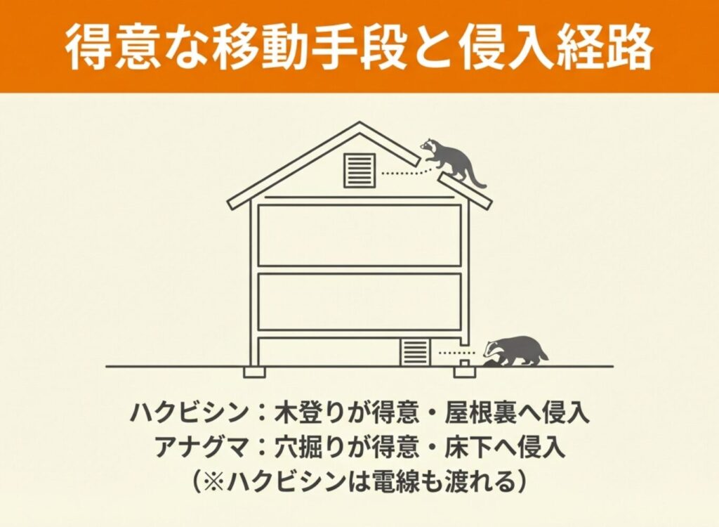 生態面では、ハクビシンは木登りが得意で高い場所から侵入し、アナグマは穴を掘って地中から侵入するという対照的な特徴があります。