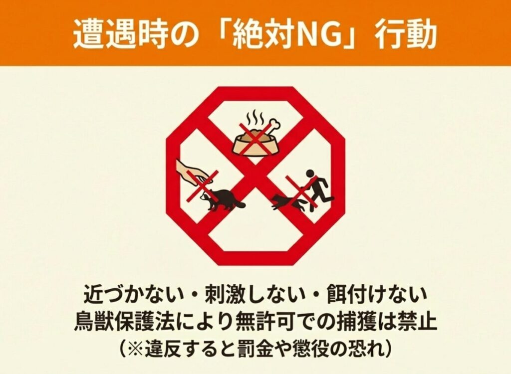 どちらの動物も、見かけた場合は近づかずに静かに離れるのが最も安全な対応です。