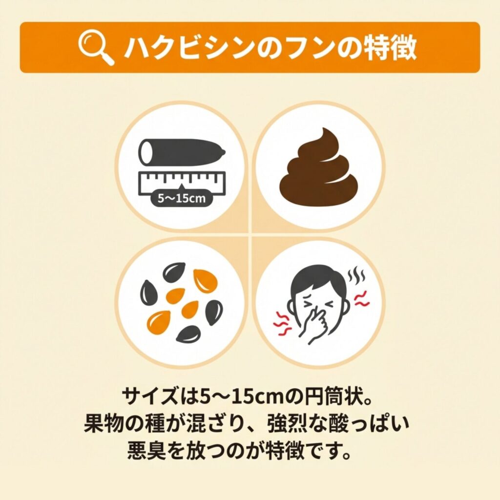 ハクビシンのフンは5〜15cm程度のサイズで果物の種子が混入していることが特徴であり、他の動物のフンとはサイズや内容物で区別できます。