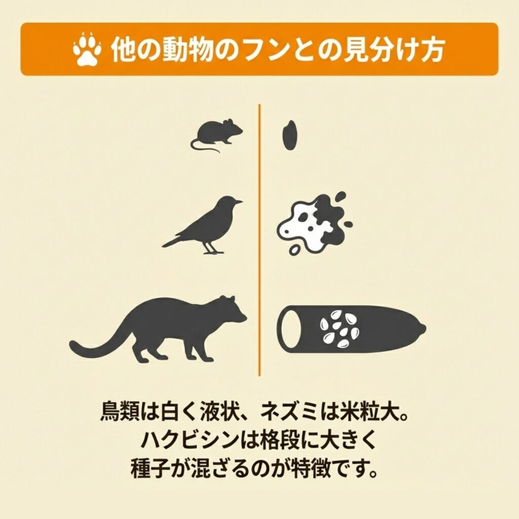 ハクビシンのフンとの最大の違いは内容物であり、果物の種子が目立つ場合はハクビシンの可能性が高いと判断できます。