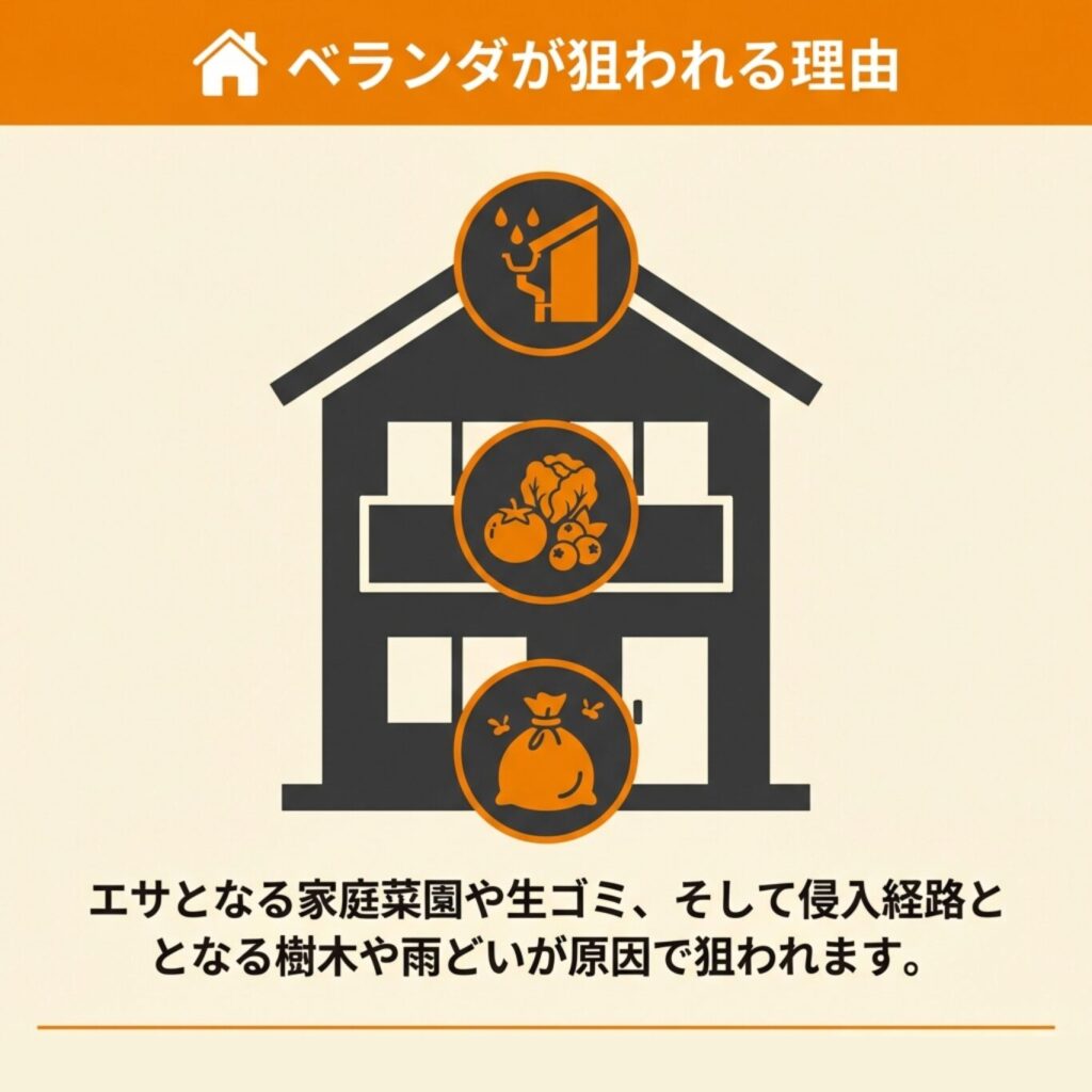 ここでは、ベランダがハクビシンに狙われやすくなる代表的な3つの原因を解説します。