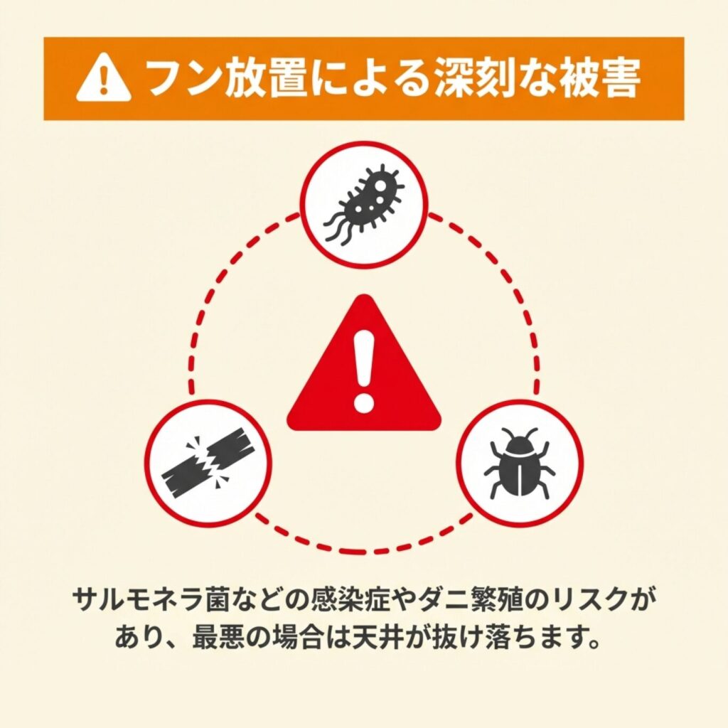 フンを放置すると、感染症のリスクやダニ・ノミの繁殖、さらには建物の劣化といった深刻な被害を招く恐れがあります。