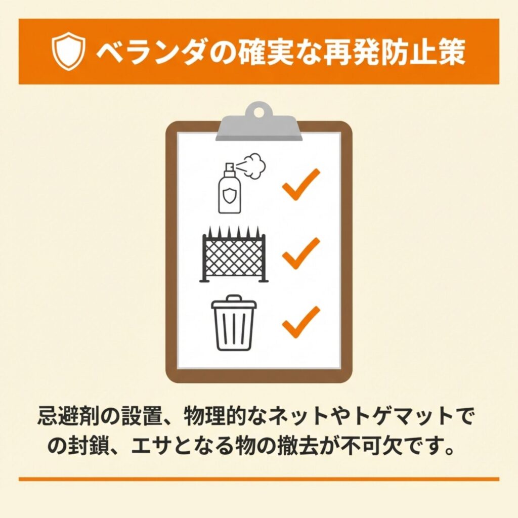 再発防止のためには、忌避剤の活用・物理的な侵入防止・エサの撤去といった複合的な対策が効果的です。