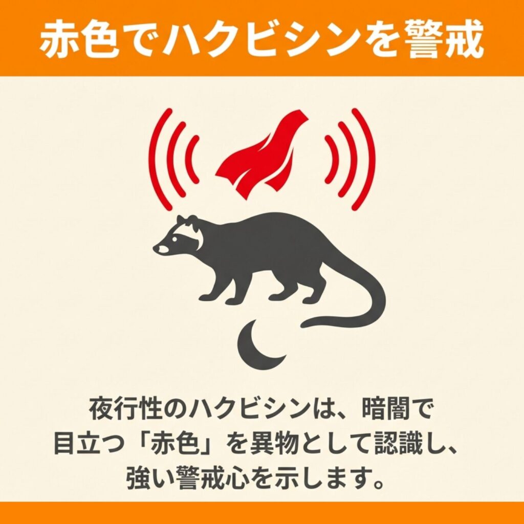 ハクビシンは赤色を警戒しやすい傾向があり、科研費の研究データでもその反応が裏付けられています。