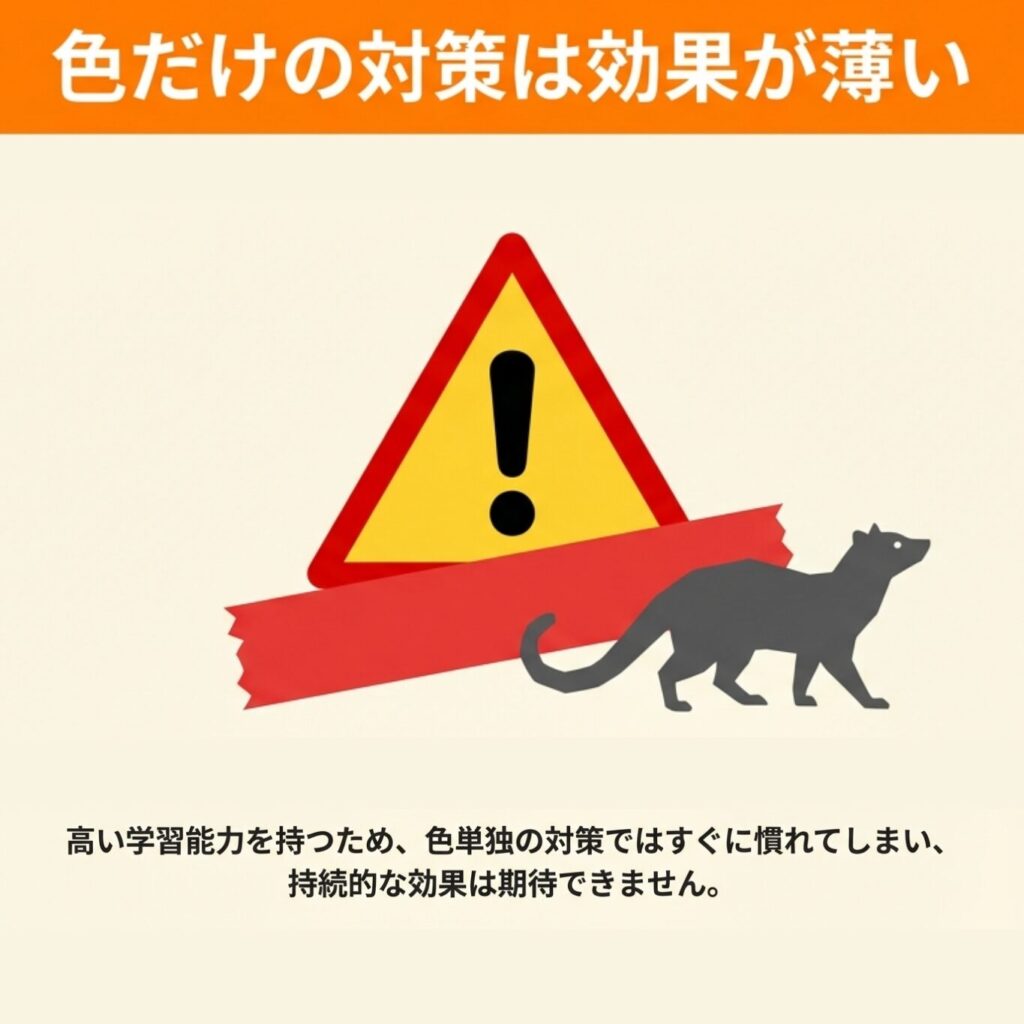 色だけの対策で効果が出ない場合は、匂い・音・物理的な封鎖など複数の方法を組み合わせてみてください。