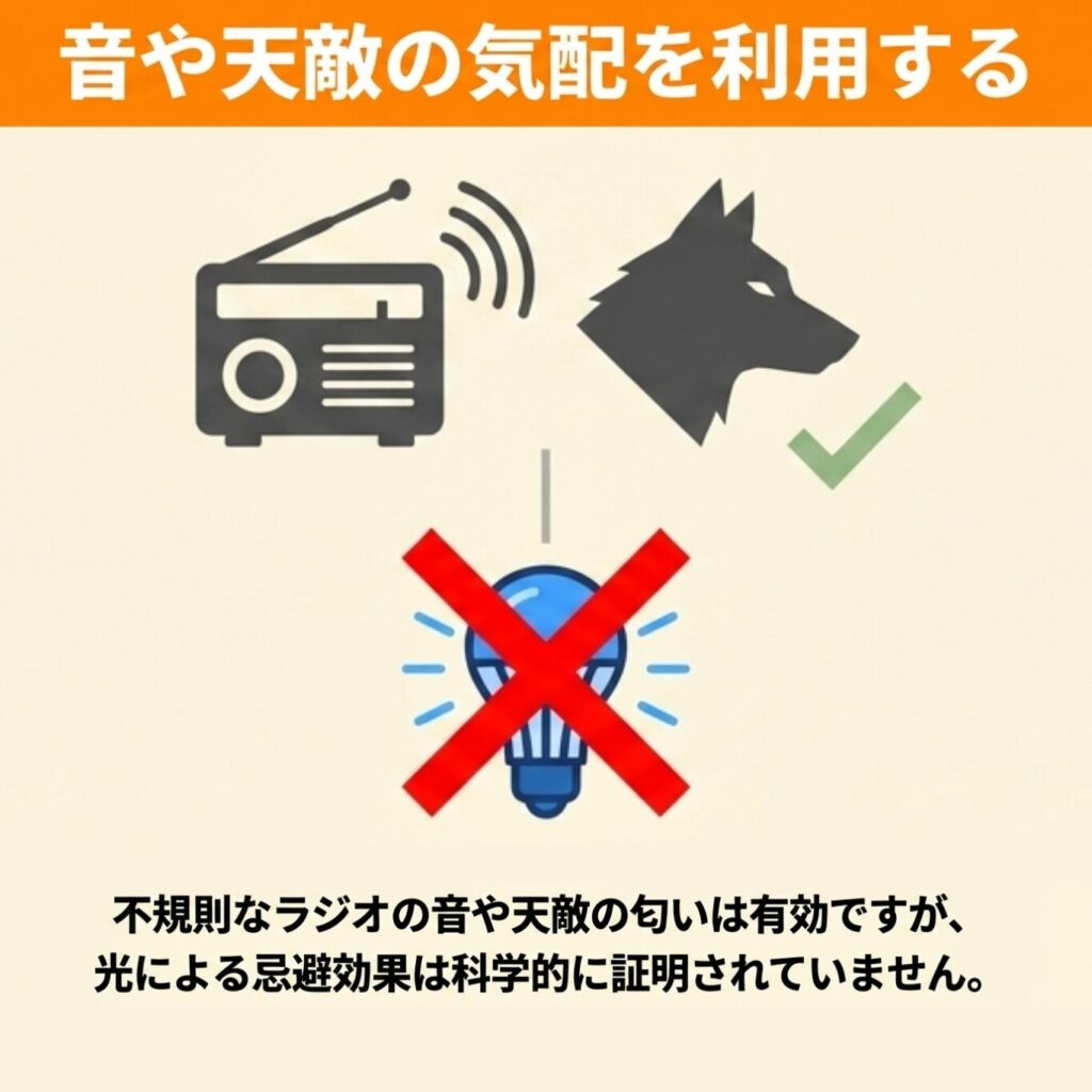 匂いの強い忌避剤は風向きを考慮して設置場所を選び、音や光は深夜や早朝の時間帯を避けるなどの配慮も欠かせません。