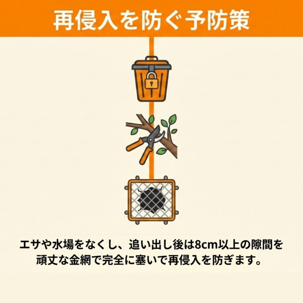 追い出しだけでは被害は終わりません。侵入経路の封鎖まで完了して初めて、再発防止が実現します。