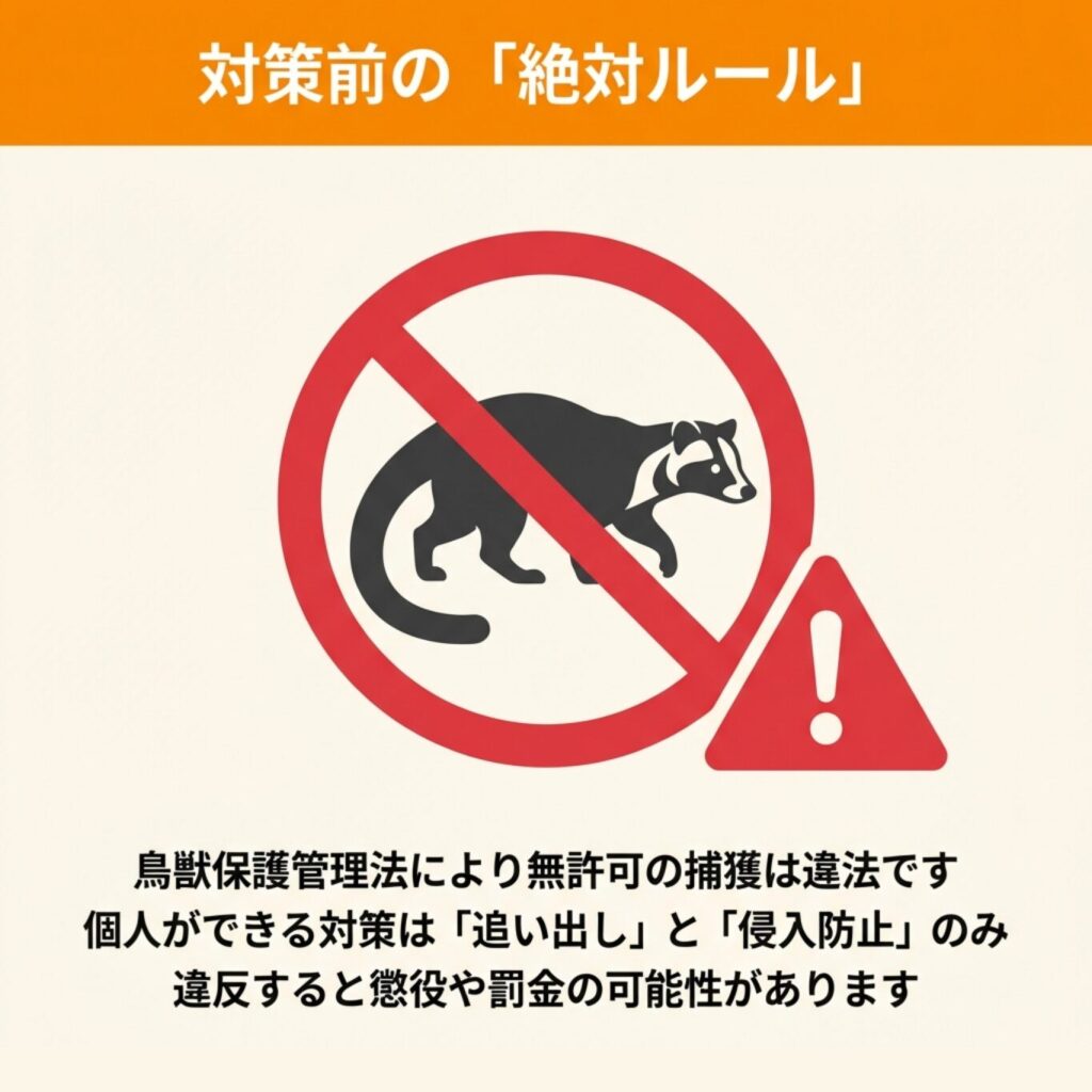 ハクビシンは鳥獣保護管理法で保護されている野生動物であり、無許可での捕獲や殺傷は法律で禁止されています。