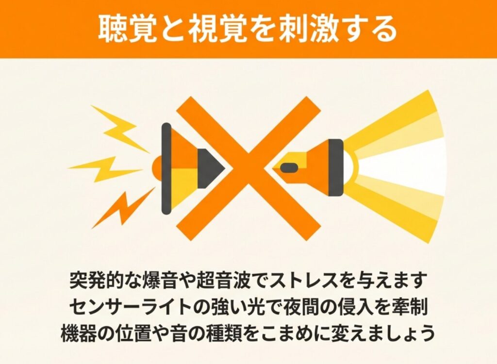 匂いと並んで効果が期待できるのが、音や光を使った撃退法です。