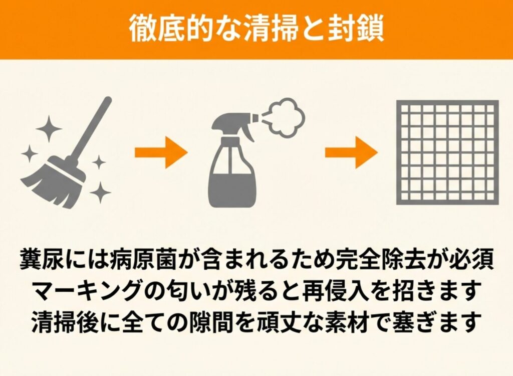 追い出した後は必ず侵入口を塞ぎ、糞尿や巣の跡を徹底的に掃除してください。