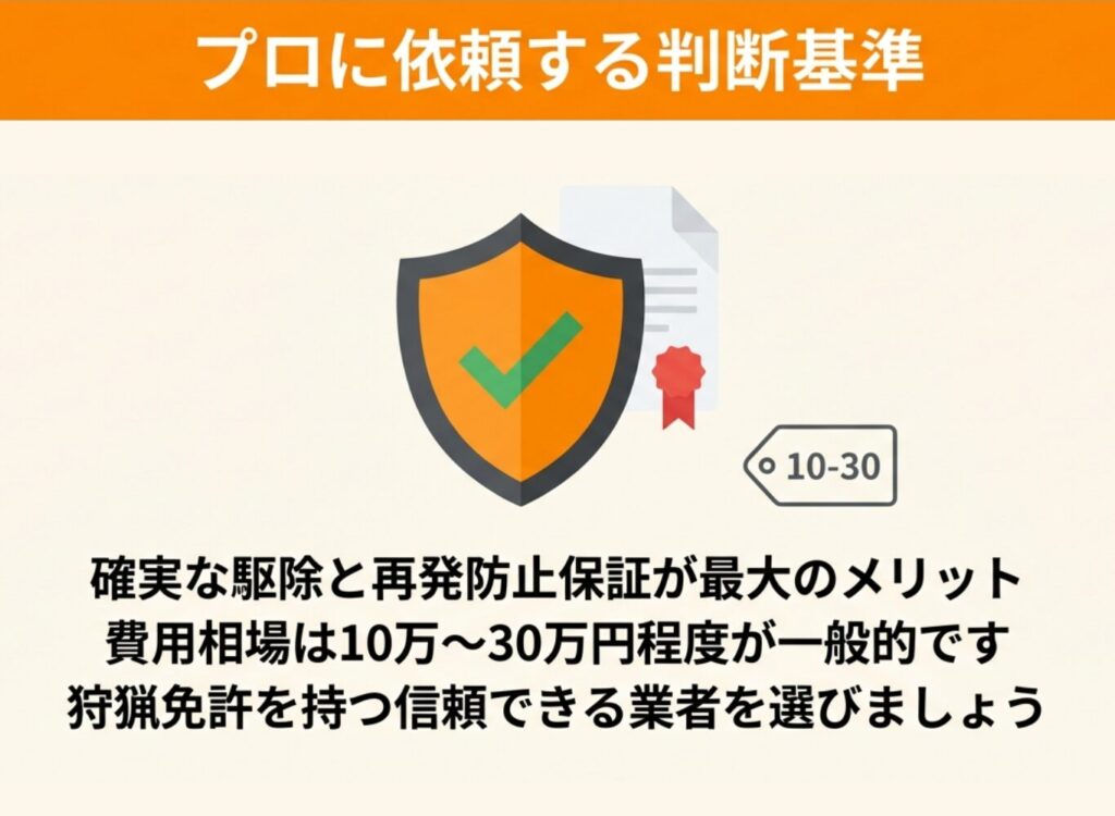 自分で対策しても効果が出ない場合や、被害が深刻なときは、専門業者への依頼を検討しましょう。