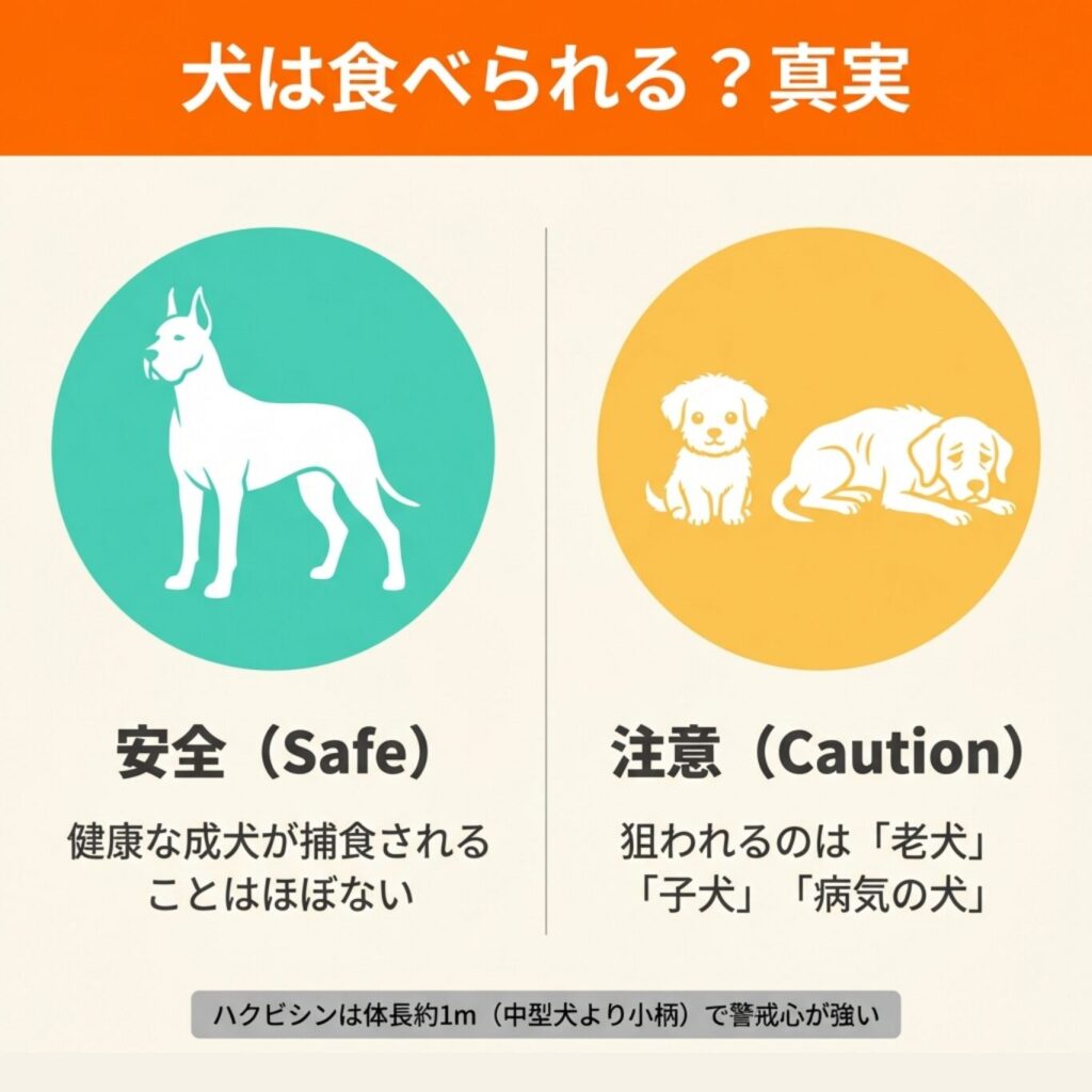 健康な成犬を襲うことは稀ですが、体力の落ちた老犬や小型の子犬は攻撃対象となる可能性があります。