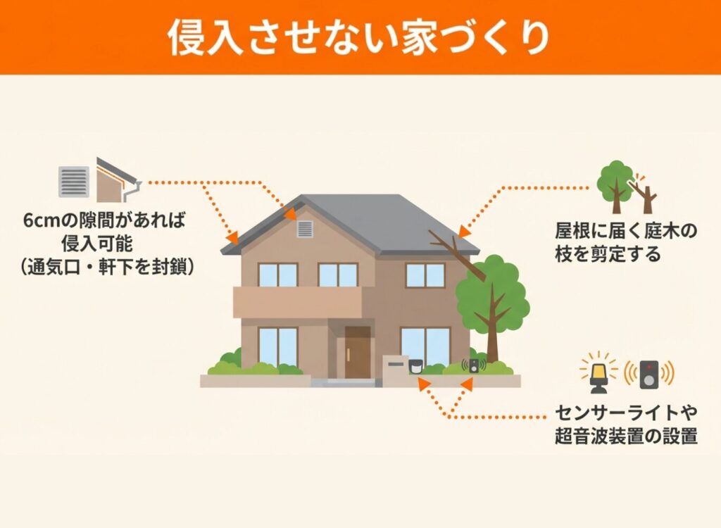 • 電線や電話線を伝って屋根に登ることもあるため、電線の状況も確認しておきましょう