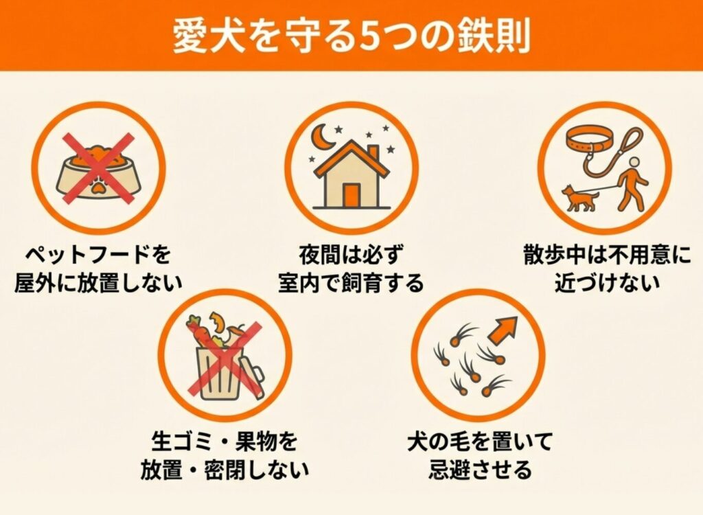 愛犬を守るためには、ペットフードを屋外に放置しない、夜間は室内飼育を徹底する、散歩中は不用意に近づかないといった予防策が重要です。