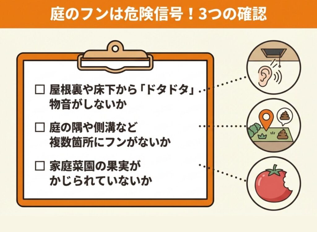 庭でハクビシンのフンを発見したら、被害の範囲を正確に把握するため、以下の3つを確認しましょう。