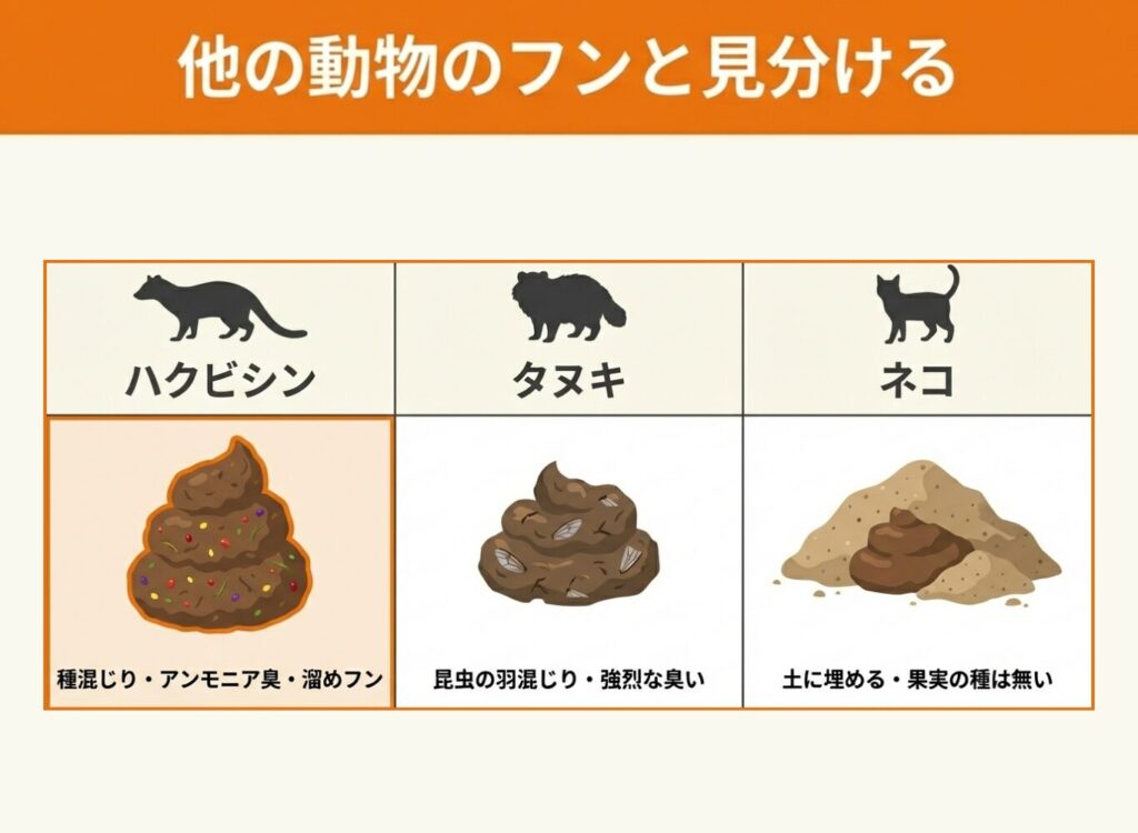 タヌキは比較的開けた場所でフンをすることがあり、隠れた場所を好むハクビシンとは異なります。