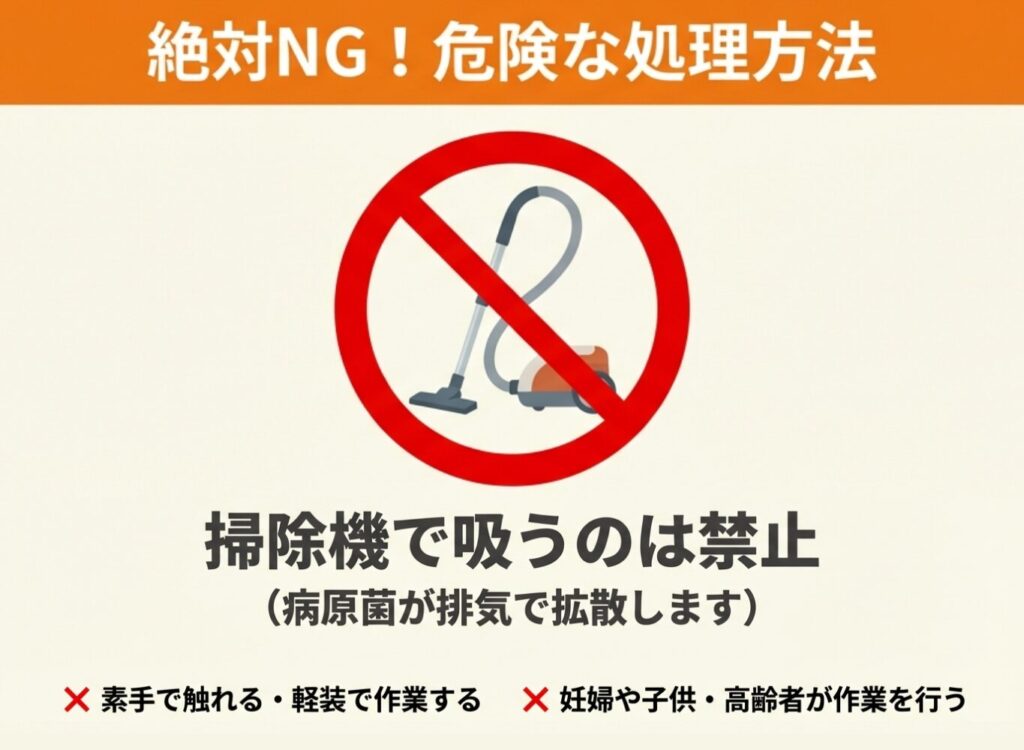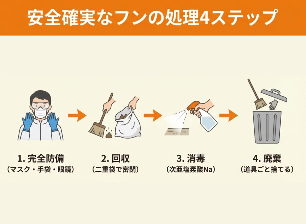 まずはフンを安全に処理し、消毒・消臭を徹底してください。