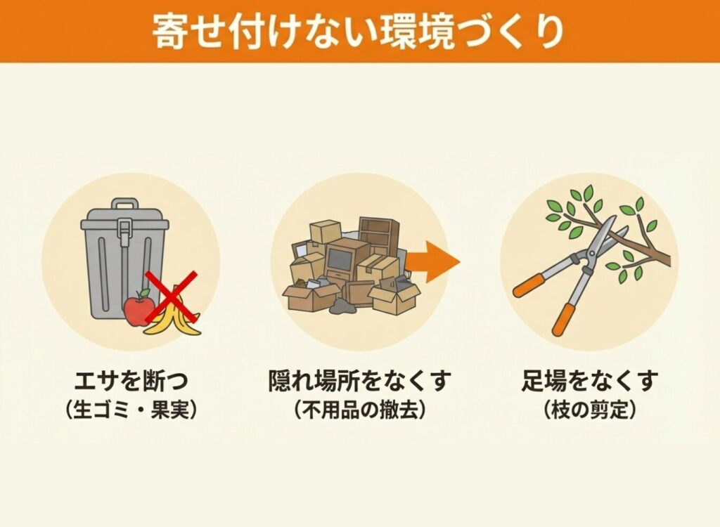 単一の対策だけでは効果が限定的なため、エサの管理、庭の整備、忌避剤の使用、侵入経路の封鎖などを総合的に行いましょう。