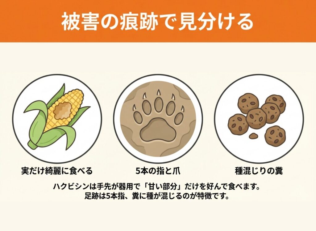 まずアライグマは、前足の指が長く器用であるため、トウモロコシの皮をむいて食べる点はハクビシンと似ているものの、足跡の形状で区別が可能です。