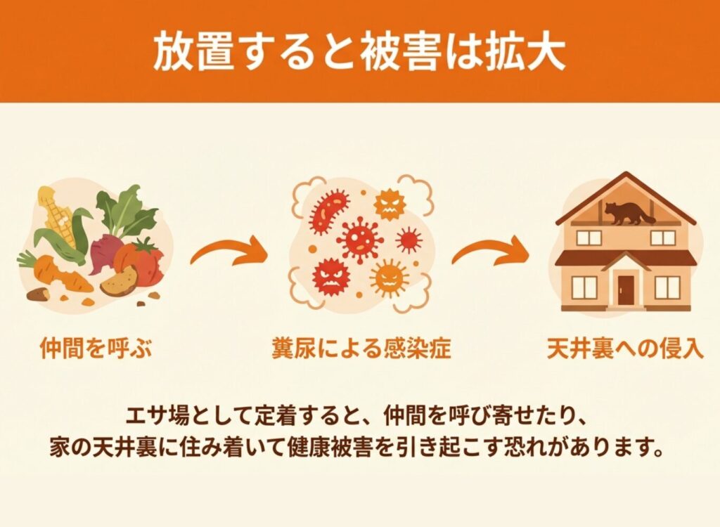 このため、最初の被害を放置してしまうと、同じ個体が何度も通ってくるだけでなく、仲間を連れてくる可能性すら出てきます。