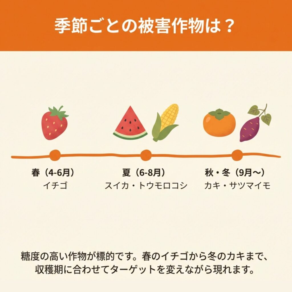 特に収穫期には被害が集中しやすいため、作物の生育状況に合わせて対策を強化することが重要です。