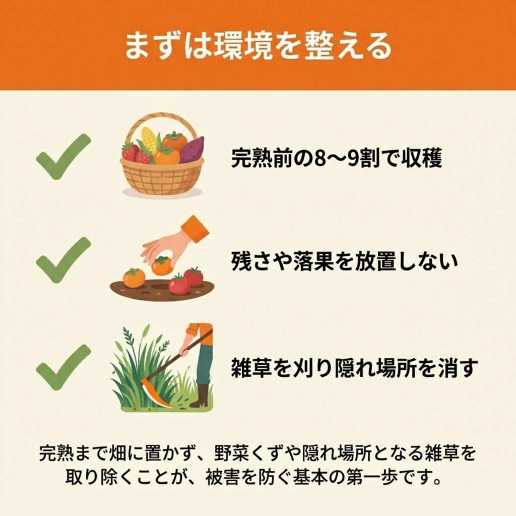 被害を防ぐためには、エサとなる作物や残さを放置しないこと、隠れ場所をなくすこと、そして電気柵などの侵入防止対策を組み合わせることが重要となります。