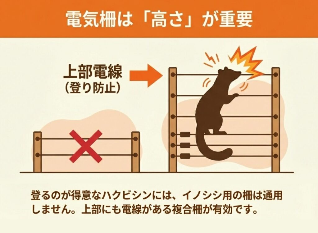 農林水産省のマニュアルでは、ハクビシンは「登ることを優先する種」に分類されており、物理的な柵だけでは効果が限定的とされています。