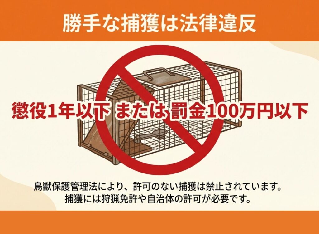 「知らなかった」では済まされない重い罰則であり、被害に遭っているからといって安易に捕獲を試みることは避けるべきです。