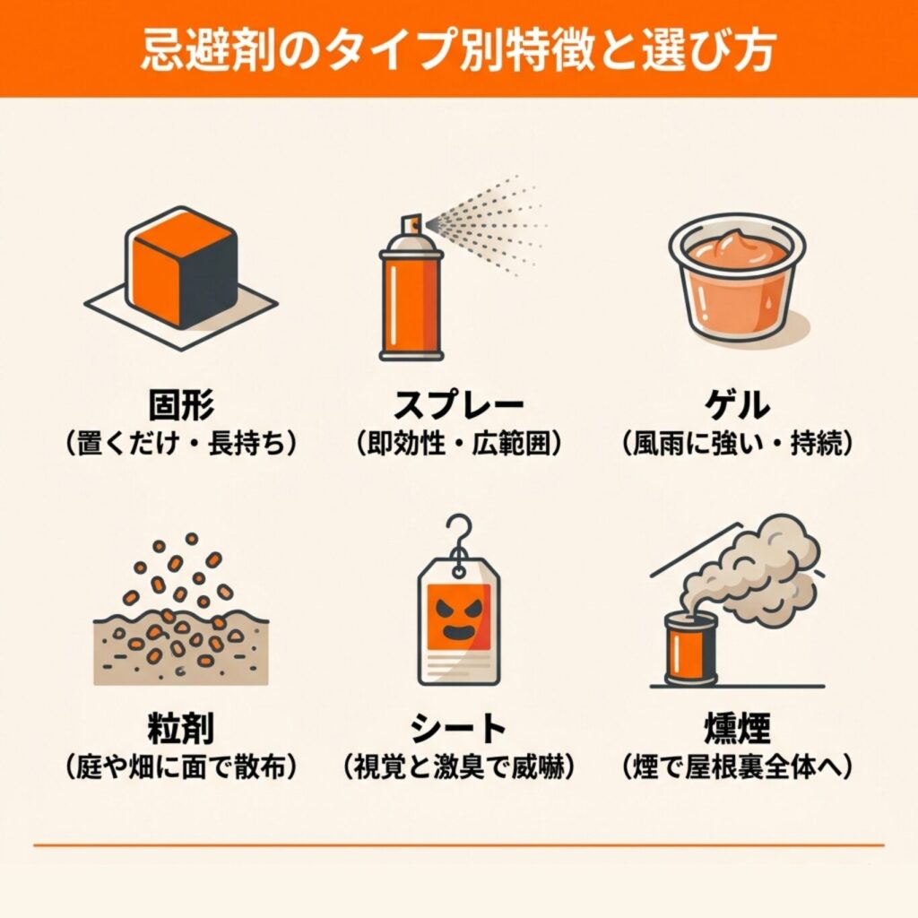 忌避剤だけでも固形、スプレー、ゲル、粒剤、激臭シート、燻煙と複数のタイプがあり、それぞれに向いている場所やメリット・デメリットがあります。