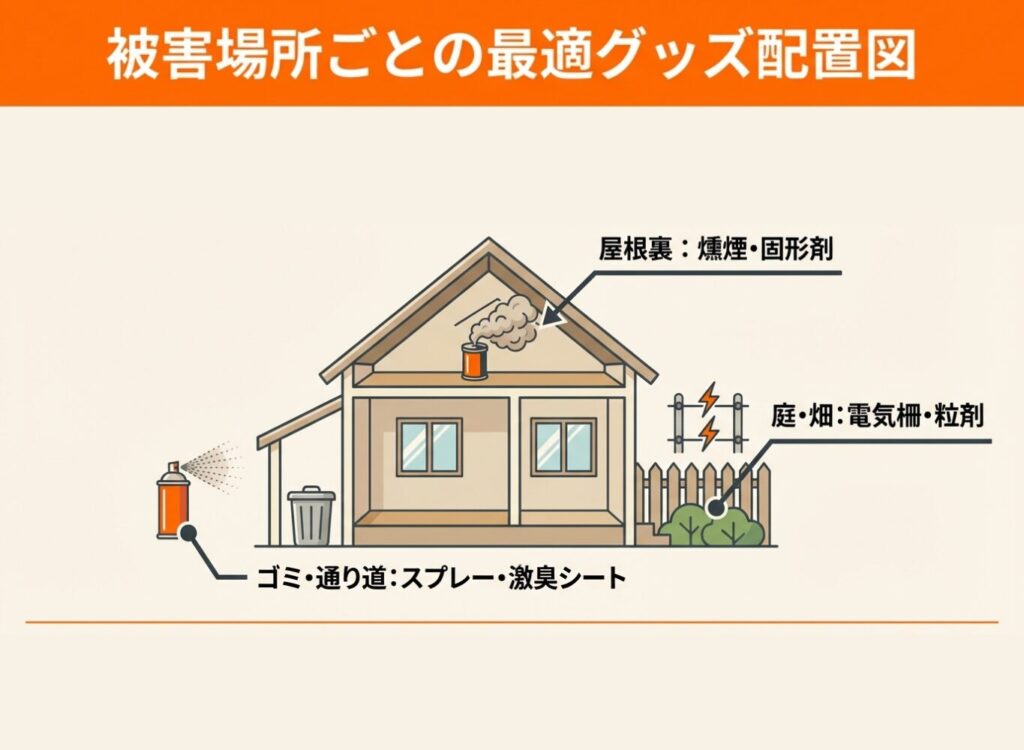 対策グッズは、被害が起きている場所の特徴に合わせて選ぶと効果が高まります。